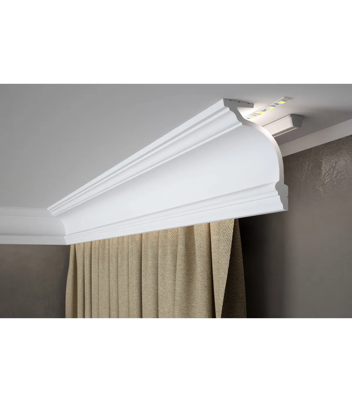 Leiste in modernem Design, speziell zum Verdecken von Gardinenstangen bestimmt. Sie stellt eine elegante Alternative zum Verdecken oft unansehnlicher Gardinenstangen mit Gipskarton- oder Holzplatten dar. Sie ist leicht und ermöglicht die Anbringung der heute so beliebten LED-Beleuchtung.