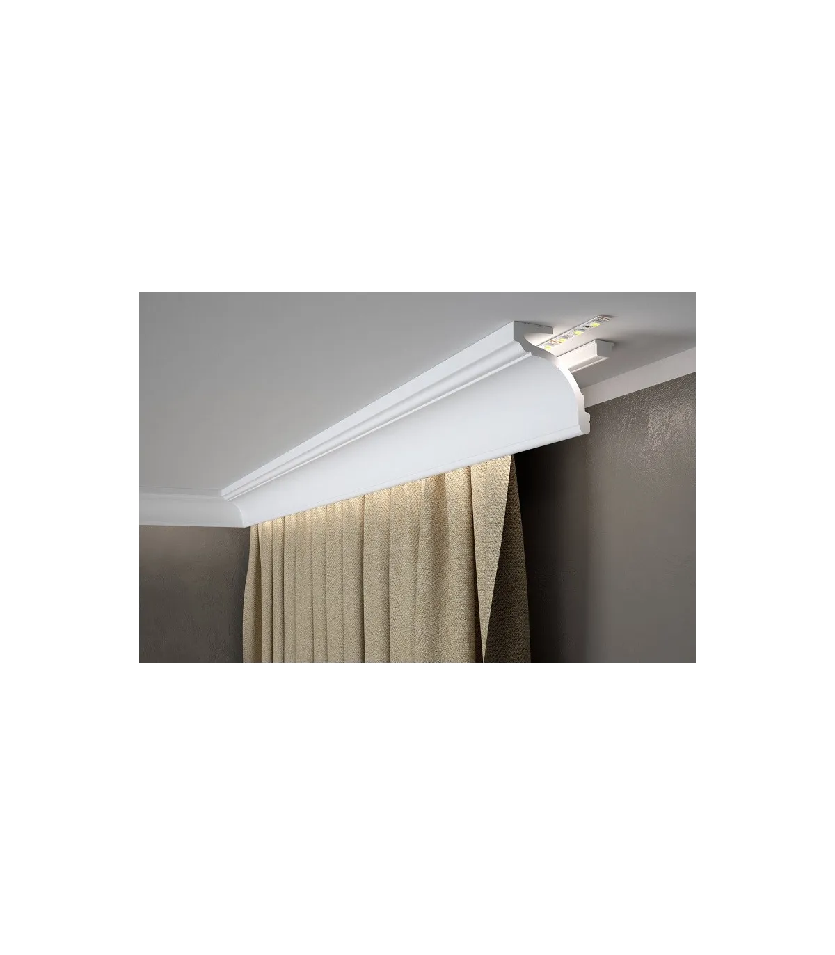 Leiste in modernem Design, speziell zum Verdecken von Gardinenstangen bestimmt. Sie stellt eine elegante Alternative zum Verdecken oft unansehnlicher Gardinenstangen mit Gipskarton- oder Holzplatten dar. Sie ist leicht und ermöglicht die Anbringung der heute so beliebten LED-Beleuchtung.